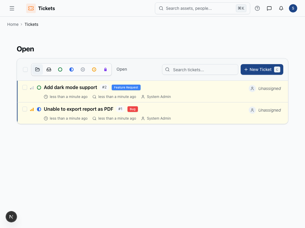Tickets OverviewHandle support tickets and issue trackingWelcome to the Tickets documentation. Handle support tickets and issue tracking Features Tickets Dashboard Reports Forms Was this page helpful?YesNo
